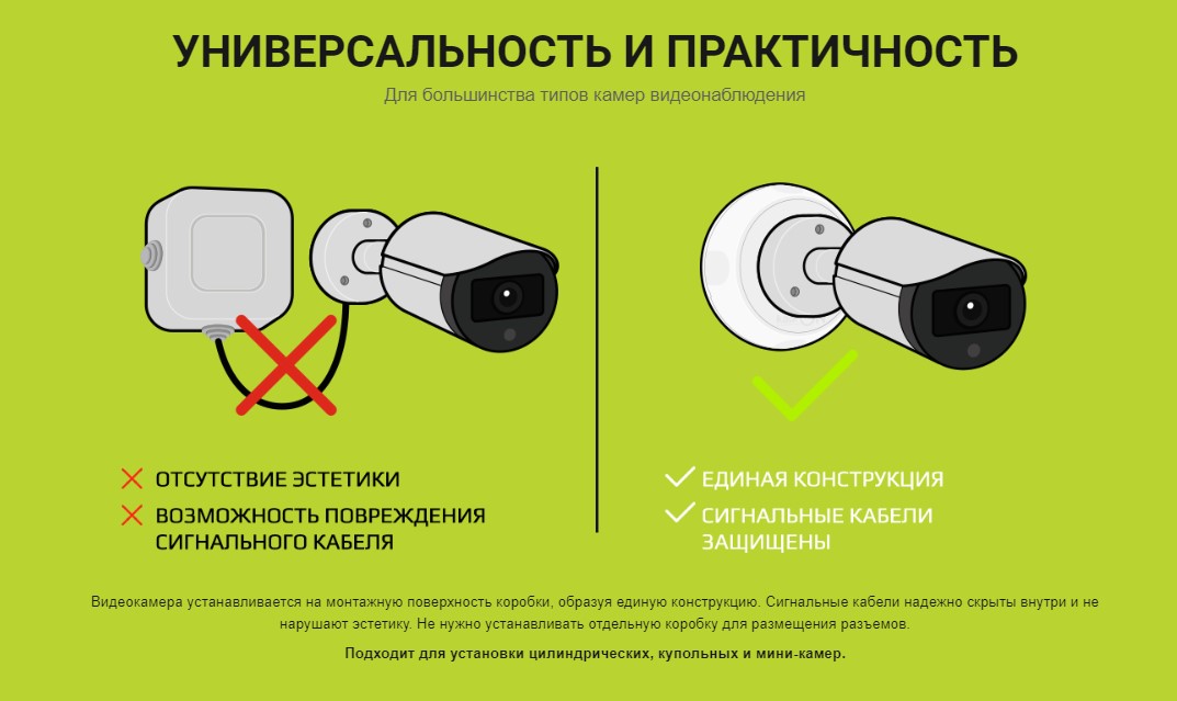 Универсальность. Монтажная коробка KadrON предназначена для установки камер видеонаблюдения с посадочным диаметром до 98 мм. Совместима с видеокамерами различных производителей – Dahua Technology, RVi, QTech, Hikvision, HiWatch и др. Подходит для установки купольных, цилиндрических и мини камер видеонаблюдения.