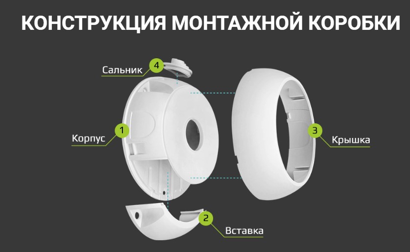Всепогодное исполнение монтажной коробки KadrON позволяет устанавливать ее на улице. Защита от попадания воды и пыли в корпус изделия благодаря продуманной конструкции монтажной коробки.